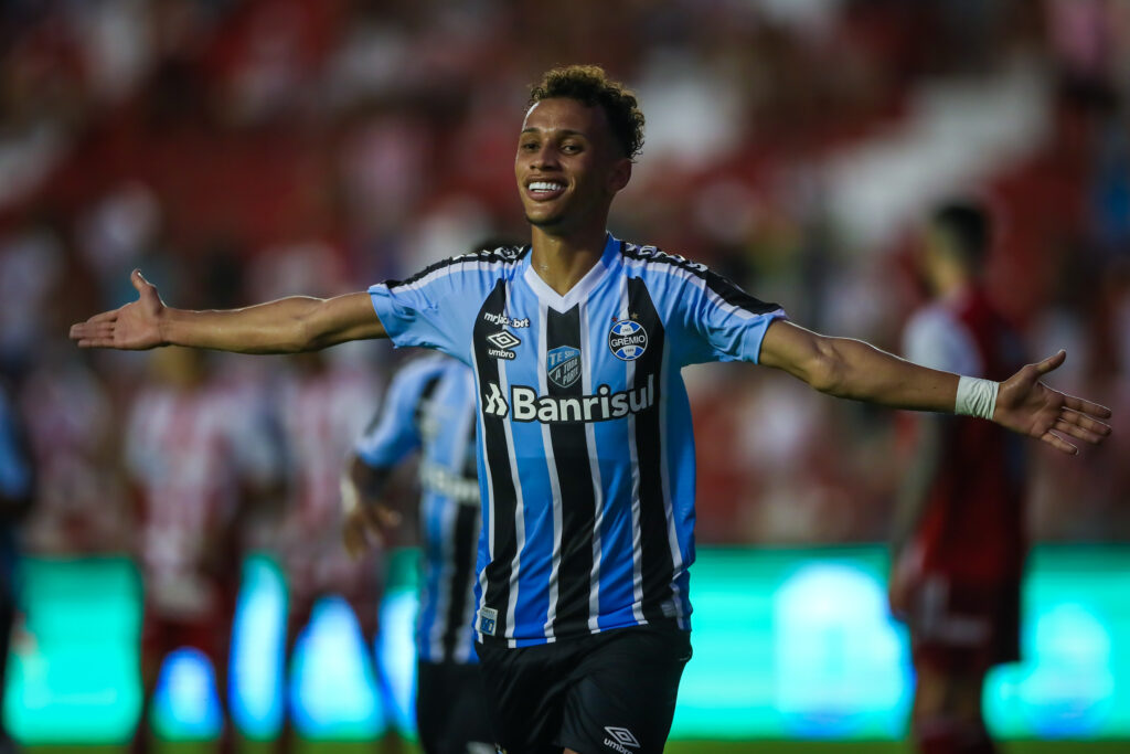 Bitello marcou o primeiro e o terceiro gol na vitória de 3 a 0 do Grêmio sobre o Náutico. FOTO: LUCAS UEBEL/GREMIO FBPA