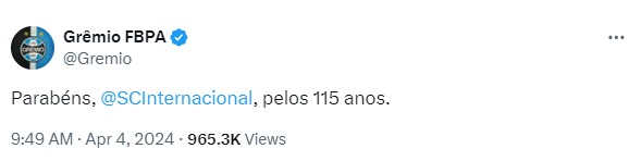 O maior rival colorado é o Grêmio, o outro time que disputa as competições da elite do futebol brasileiro sediado em Porto Alegre. Nas redes sociais, o tricolor deixou a rivalidade de lado, e parabenizou os colorados pelo aniversário.