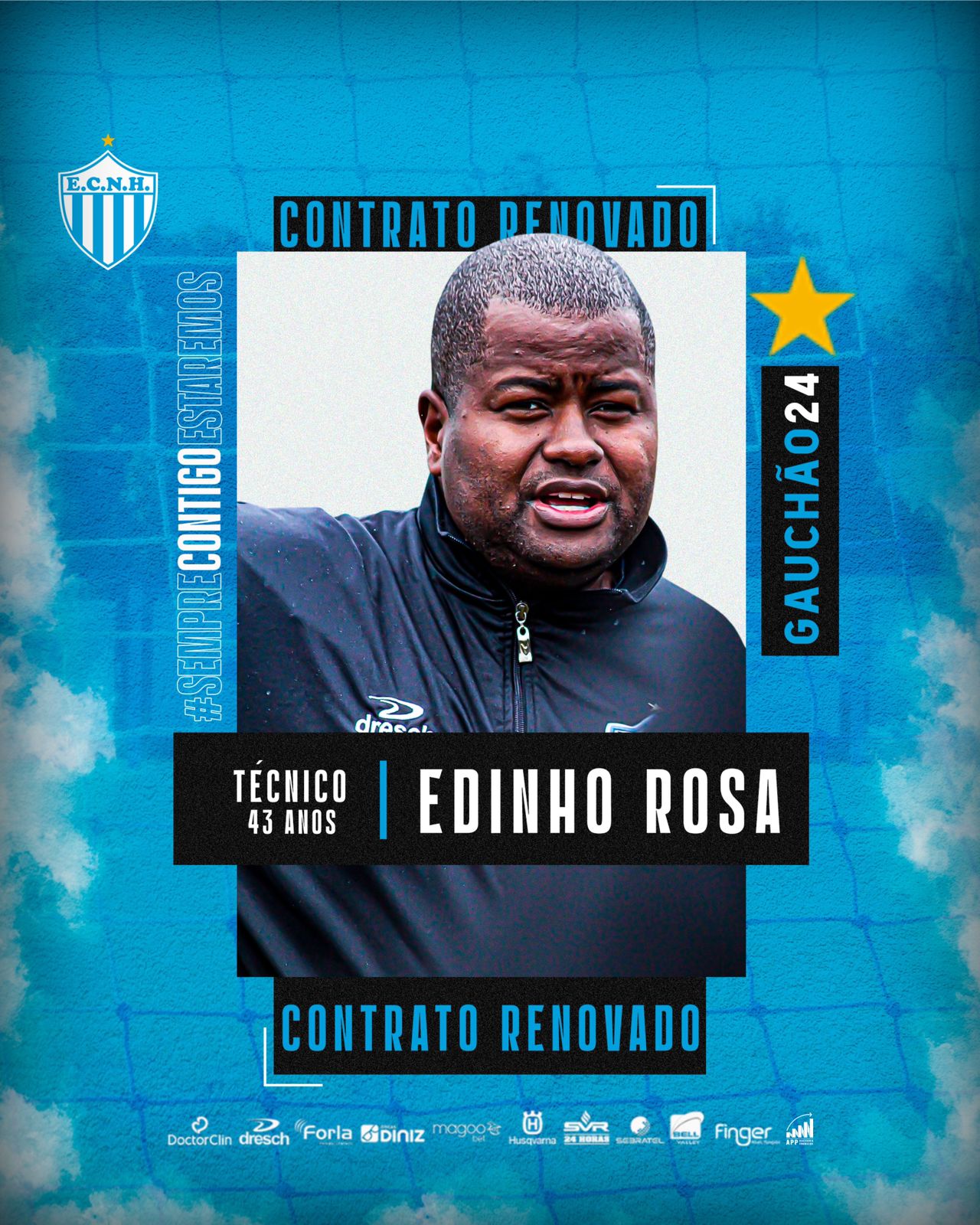 O Esporte Clube Novo Hamburgo oficializa a permanência do técnico Edinho Rosa e comissão técnica para o Campeonato Gaúcho 2024. O comandante anilado falou sobre a alegria de permanecer no Noia e estar próximo a completar 50 jogos no comando anilado. “ Essa marca me deixa muito feliz, por manter essa sequência de trabalho nesse grande clube. Seguimos juntos em busca de um ano cheio de vitórias e conquistas. Agradeço à Deus essa Glória”, destacou.