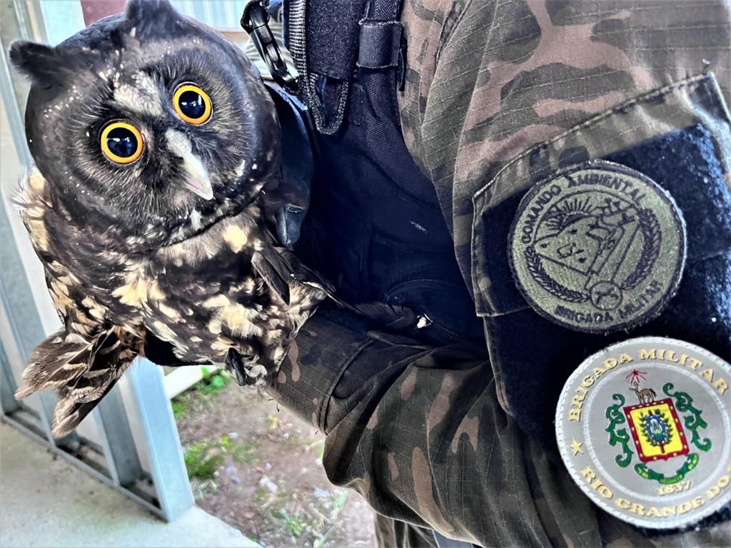 Após a solicitação de operários, os policiais militares, do 3º Batalhão Ambiental da Brigada Militar, resgataram, nesta terça-feira (06/06), um exemplar de Mocho-preto ou Coruja-diabo, em Gramado.