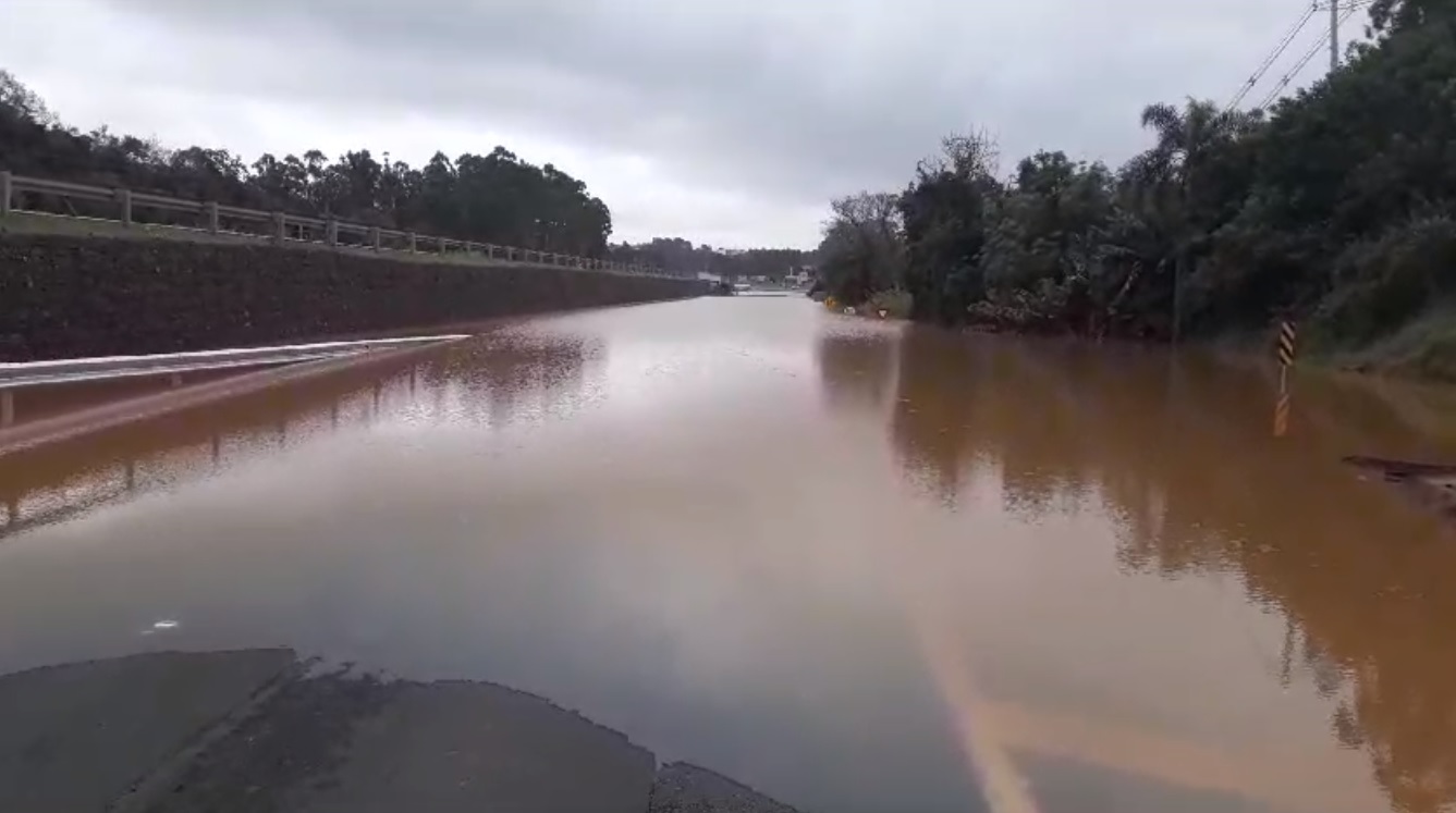 Bloqueio total entre Santo Antônio da Patrulha e Caraá (km 1,7). O arroio Carvalho transbordou e o desvio está alagado. A interdição ocorre até que o volume da água baixe.