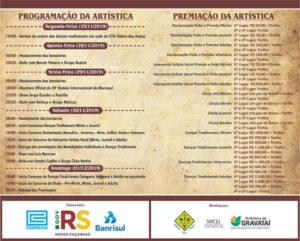 Durante os cinco dias de programação, estão previstas diversas apresentações artísticas e campeiras, shows, bailes e festivais tradicionalistas. Nas competições, muitos prêmios serão distribuídos, nas mais diversas categorias. Os destaques na programação ficam por conta dos shows do Baila Banda da Vanera, Grupo Rodeio, Bailaço, Grupo Matizes, Luiz Marenco, Sandro Coelho e Grupo Chão Nativo.